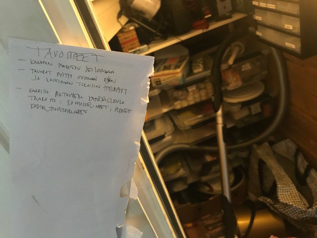 Aluksi määrittelimme tavoitteita ja selvitimme, mitä tavaroita komerossa toivottiin jatkossa säilytettävän ja mitä puolestaan ei. Järjestämisurakan tavoitteeksi asiakas määritteli seuraavanlaisiksi: