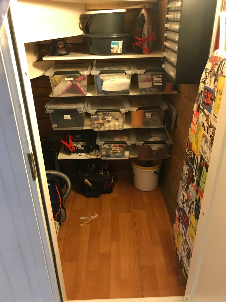 - Kaapissa on aktiivisessa käytössä olevia tavaroita: siivousvälineitä ja pieniä kodinhuoltotarvikkeita